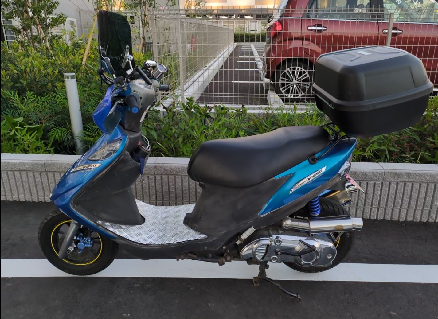 風防とナックルガード付き、リアボックス搭載、社外マフラー交換、フロントカウルに英文字ステッカー