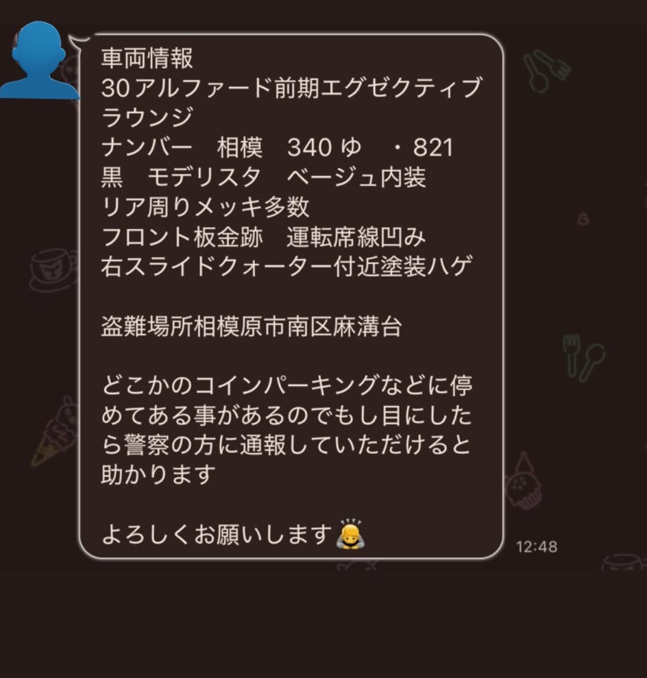 知り合いの車が盗難されました。 30アルファード 黒のモデリスタ 相模 340 ゆ ・821 相模原市南区麻溝台 お見かけした際は警察に通報お願いいたします。情報提供もお待ちしております